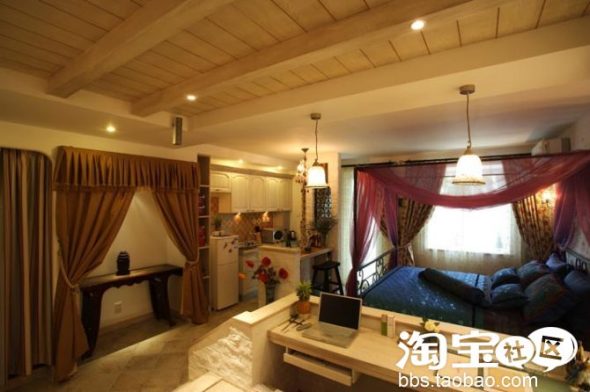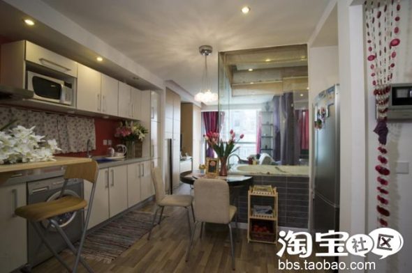 1、 由于房子本身不大,所有的功能性分区又都是必不可少的。设计师没有对空间做硬性的分隔,而是让所有分区都和谐的“相处”在一个大空间里; (图2)