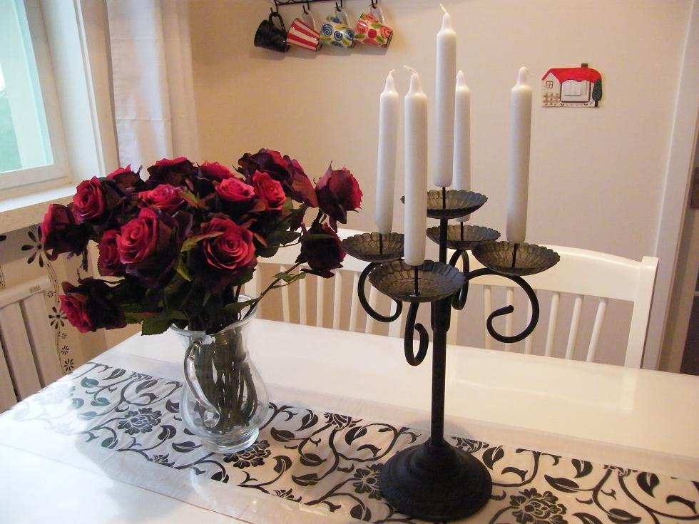 仿真花,烛台和桌旗,我妈说摆这么热闹一看就知道不会做饭