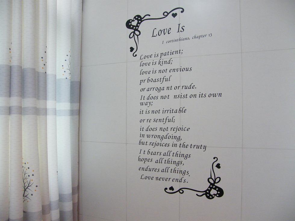 阳台上的墙贴 《爱是忍耐》,窗帘有点儿老气,还好在屋里看不到
