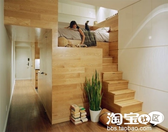 这是套位于纽约的公寓叫做East Village Studio。在狭小的不足40平米的空间里,设计师极尽空间谋划之能事,满足了业主复杂多样的功能,其中包括居住,会客,工作,厨卫设施和大量的储藏空间。