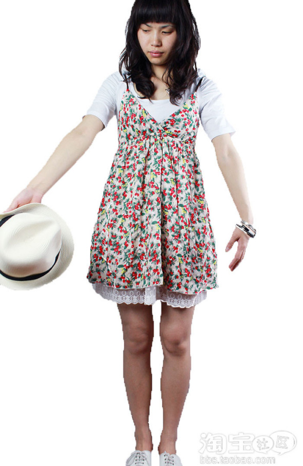 小樱桃大摆碎花裙,时尚的草帽,两件套的搭配,时尚又随意哦,