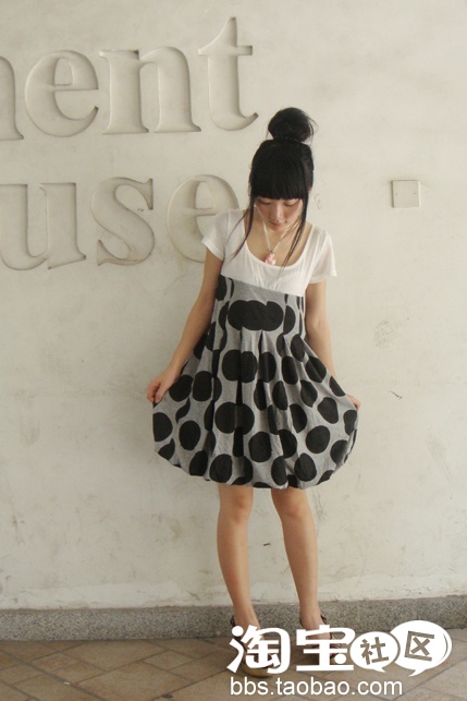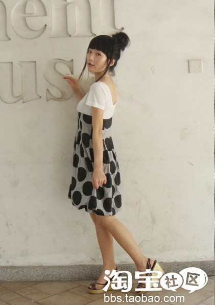 拼接款的感觉哦,小上半身是白色的,下面全部是大圆点,一般大圆点穿起来,会很容易显胖,这一款之所以不会显胖,就是设计师在高腰的位置采用了层叠垂直的效果,令裙子有蓬起来的味道却又不会显胖。