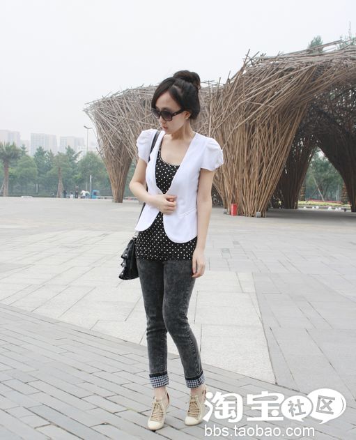 里面的小点点背心也是百搭款,配白色的外套特别好看,泡泡袖也是今年的流行风。