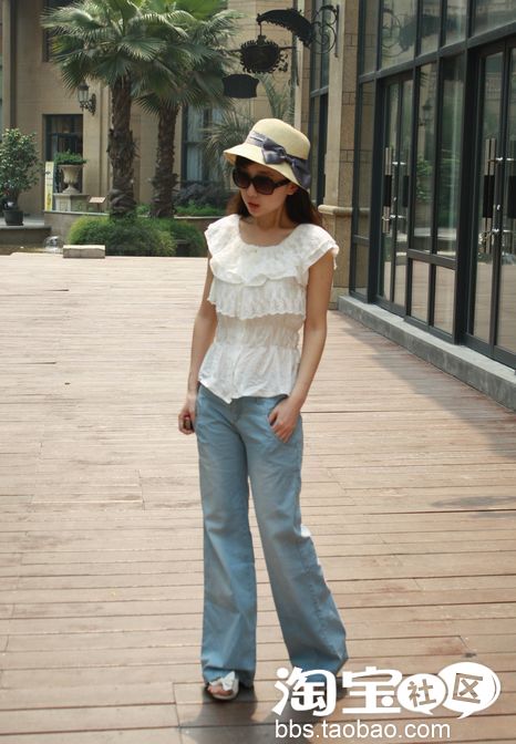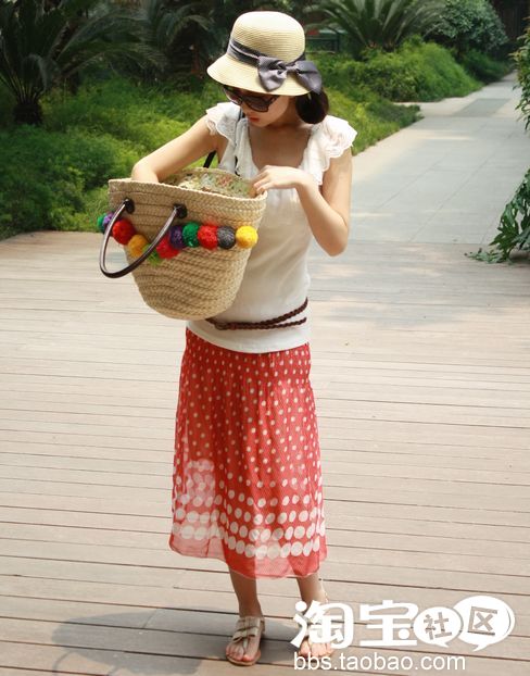 草帽,百搭蕾丝边T,沙滩裙,草编包,沙滩女的打扮,呵呵~很夏天。