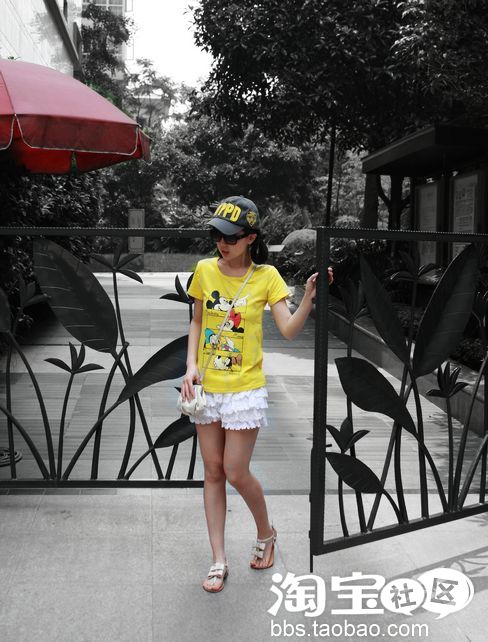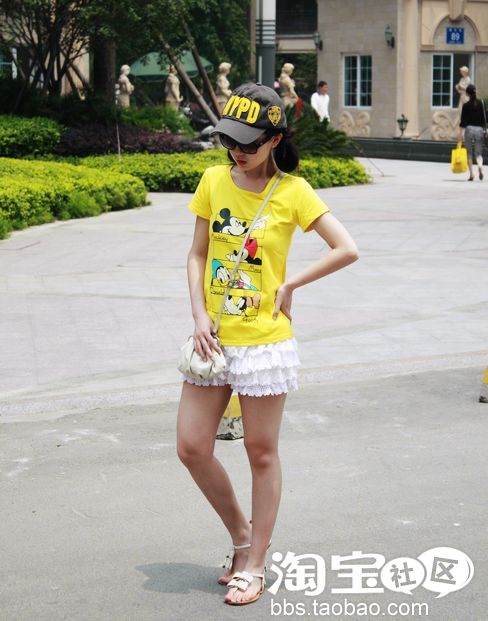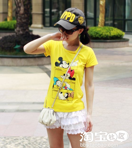 夏天的亮色T,米奇,唐老鸭,流行的图案,显瘦的蕾丝裙裤,也可爱的一套,呵呵。
