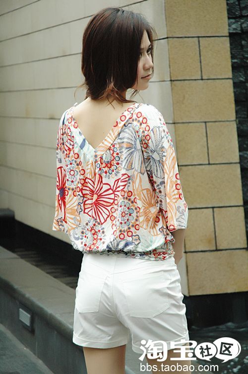 圆点耸肩雪纺拼接棉T恤+高腰白色短裤,