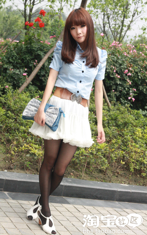搭配白色花边裙和腰带,整套很有复古甜美的感觉。