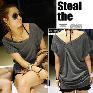 韩版新款大V领宽松大码短袖露肩长款蝙蝠衫