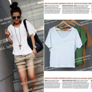 李孝利大V领宽松蝙蝠短袖女装T恤