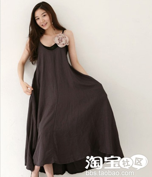 小秘密:娃娃吊带长裙,颜色比较沉闷,但是超大裙摆传递出轻盈感,随性慵懒,花形布质胸针与长裙材质相搭,很有家居风格。