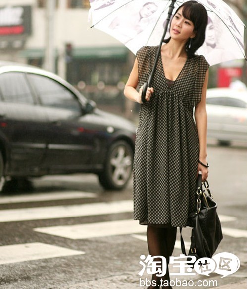 小秘密:经典的细圆点雪纺V领长裙,经典而透着小女人的细腻。高腰设计,带出可爱甜美气质,搭配黑色丝袜和手袋,很有日本OL的味道。