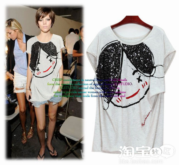 欧美明星大牌范儿~今夏潮Tee,用了亮片娃娃的形象体现出来可爱又不是高贵气质用宽松的感觉觉得好飘逸噢!