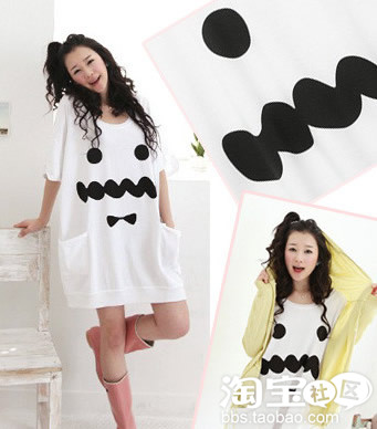 时尚解析:圆圆的大眼睛,弯弯曲曲的波浪线,下方还有一个小巧的蝴蝶结!别出心裁又充满童趣的小女生最爱这款涂鸦衫,搭配长长的卷发,掩不住的可爱装!