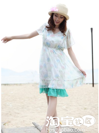 6、一眼看上去就很清新和温柔的颜色,一朵朵的小碎花也分外诱人,颜色比较的清新甜蜜的粉色,清新的绿色,冰霜的粉蓝,衬托在白色的飘逸雪纺上,很仙女!浪漫的水袖边和可爱的兔牙花边,也添加少许的天真气息,小波点的拼接雪纺荷叶边也是此款YY的重点。