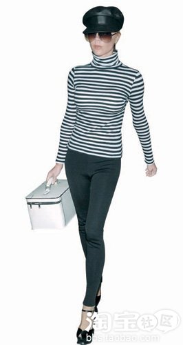 点评:Victoria Beckham巧用条纹的活跃感,打破整体黑配白的单调,礼帽、太阳镜、手提箱、高跟鞋,都围绕条纹的元素展开了奇妙的旅行。