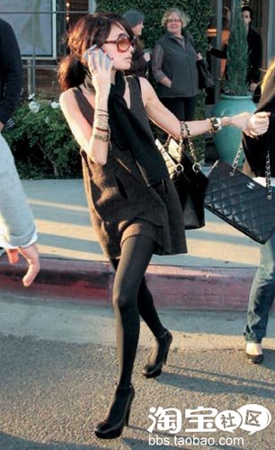 点评:略显颓废的Nicole ,将黑色连衣短裙、黑色丝巾、黑色手袋和高跟鞋组合在一起,更显纤瘦,各式风格的手链混搭丰富细节的华丽感