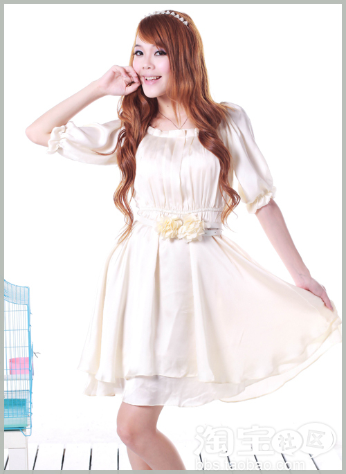 真丝缎面的材质,中袖的长度,刚好遮掩肉肉的胳膊。腰间的淡黄色花边腰带,与杏色的连衣裙搭配,更让甜美的公主风表露无疑!
