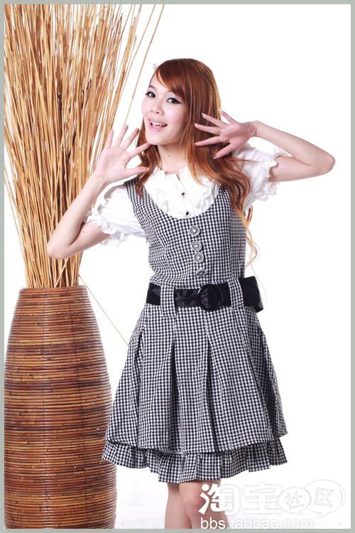 经典的衬衫背心连衣裙,让你顿时变身公主小妹!木耳边的裙体、雪纺材质的白色衬衫、黑白的格子设计,搭配黑色腰带,尽显清新气息。