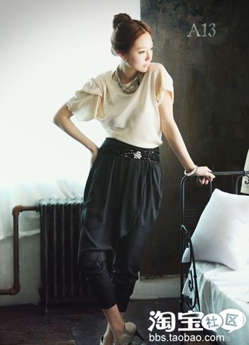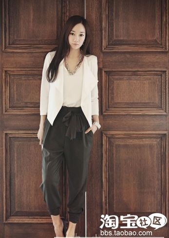 粗腿MM在选择九分裤上也要注意颜色与款式的搭配。黑色是最显瘦的颜色了,垂坠的质感加上宽松的剪裁,从腰部开始的皱褶完全遮盖了过宽的胯骨与大腿,搭配一件丝质白色上装,轻盈的妩媚感立刻显现。