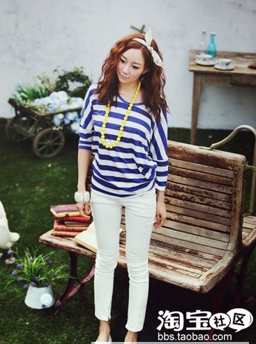 过瘦也不是好事儿,容易给人弱不禁风的感觉。在夏天,这种MM最好选择浅色系的裤装,比如白色紧身九分裤,给人视觉膨胀感,搭配时下最热的条纹上装,清爽又时尚。
