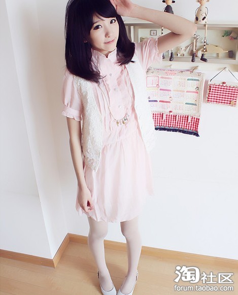 3.雪纺连衣裙+马甲+白色打底袜 打造淑女气质风