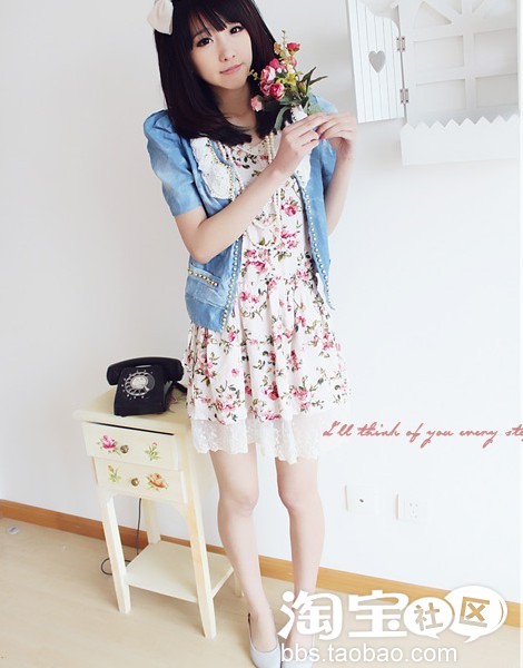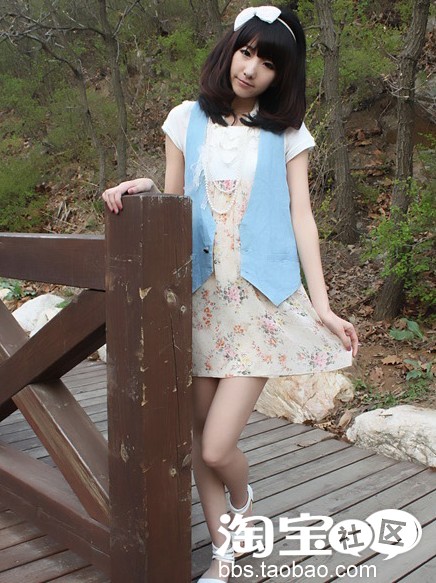8.碎花雪纺裙+牛仔马甲 打造完美邻家小妹~~