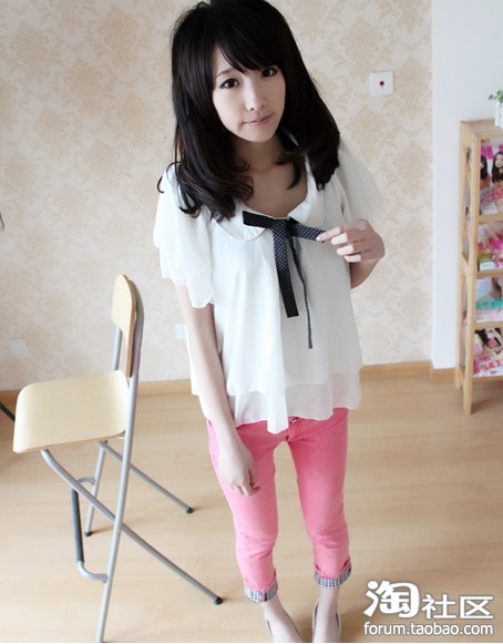 当然雪纺衫的小翻领和胸前的蝴蝶结显现出俏皮的存在~~
