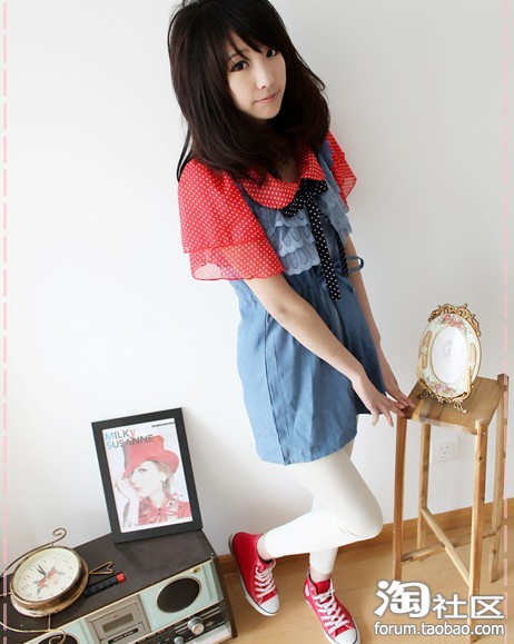 4.雪纺衫+牛仔连衣裙+白色打底袜+帆布鞋 打造可爱俏皮风