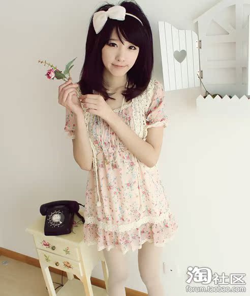 粉色的碎花连衣裙搭配白色打底裤再加上白色蝴蝶结发夹~~