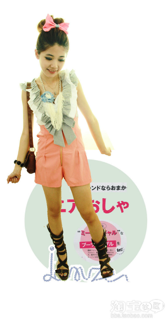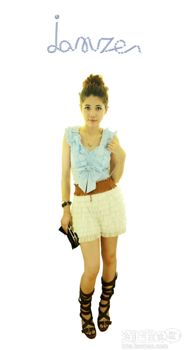 大蝴蝶结荷叶衫+蓬蓬热裤+复古腰封+手拿小包包+罗马高筒皮跟凉鞋,打造气质型小公主哦