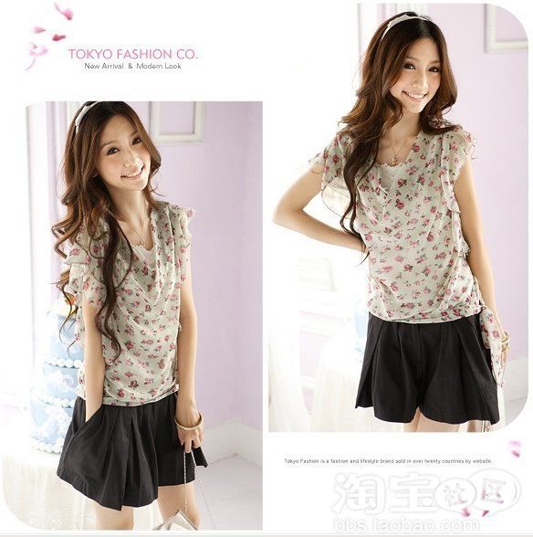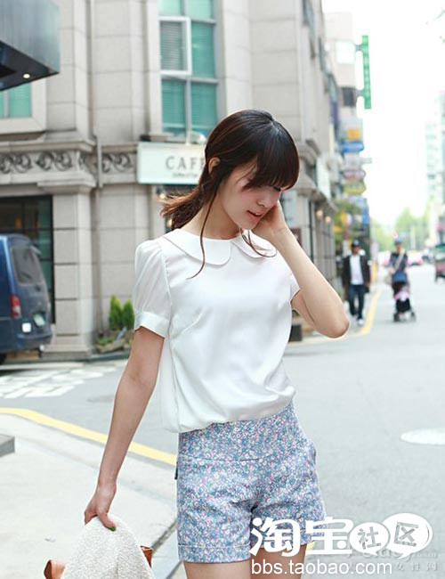 碎花短裤+白色上衣
