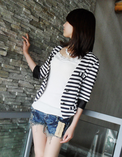 徽章条纹外套+蕾丝背心+牛仔短裤