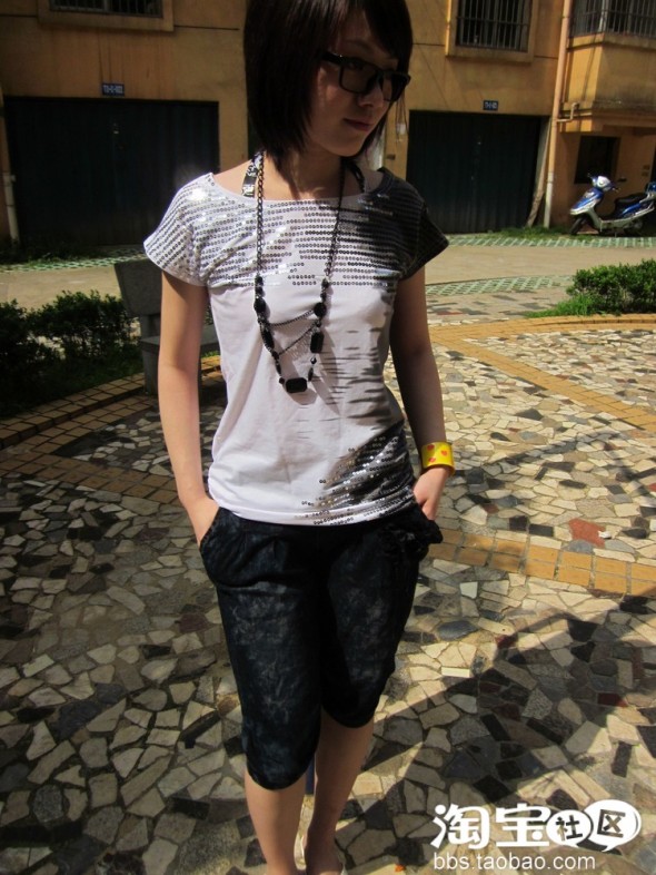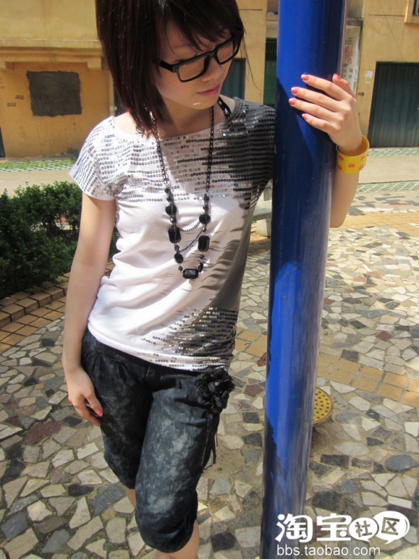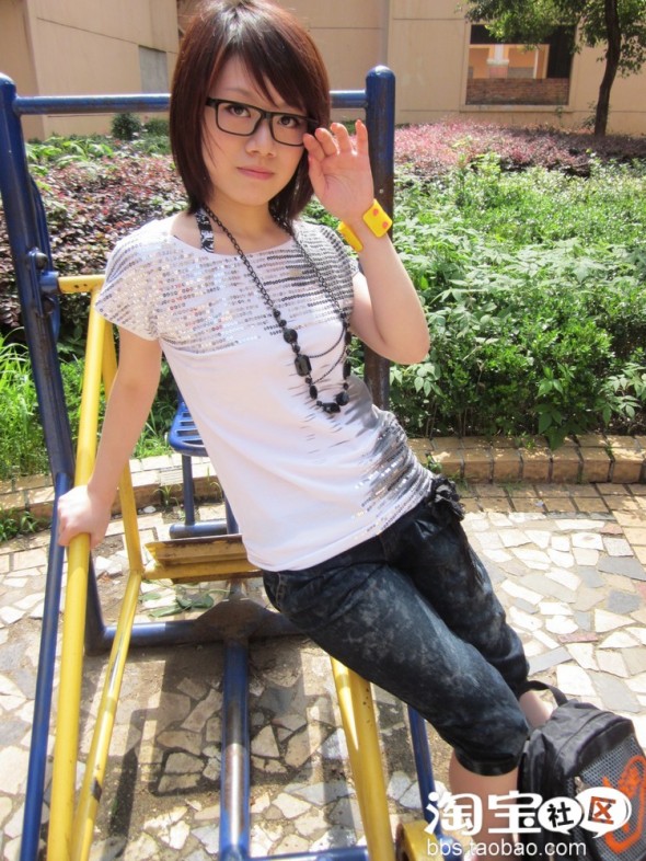 3. 亮片T+复古搭花牛仔裤+眼镜,打造不一样的个性动感小公主