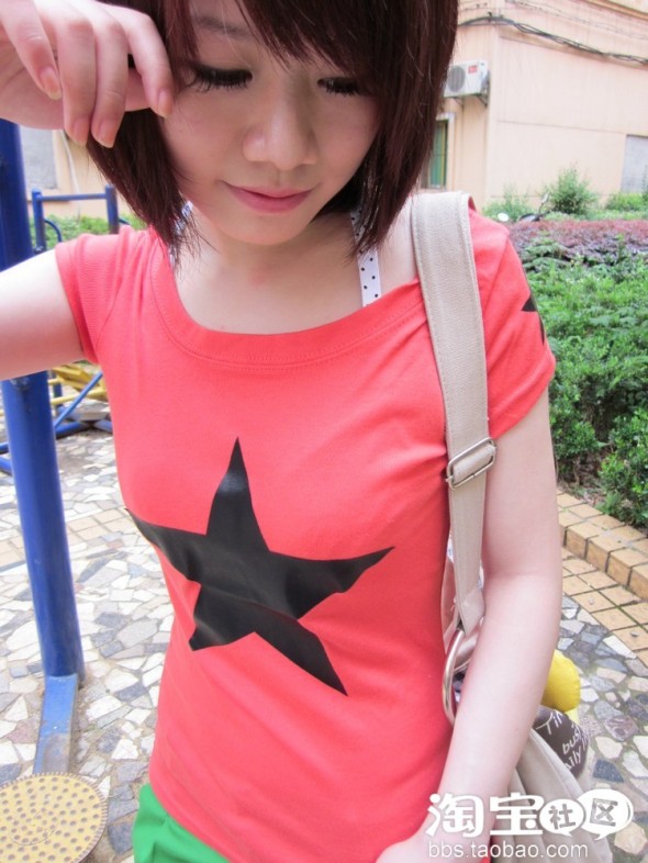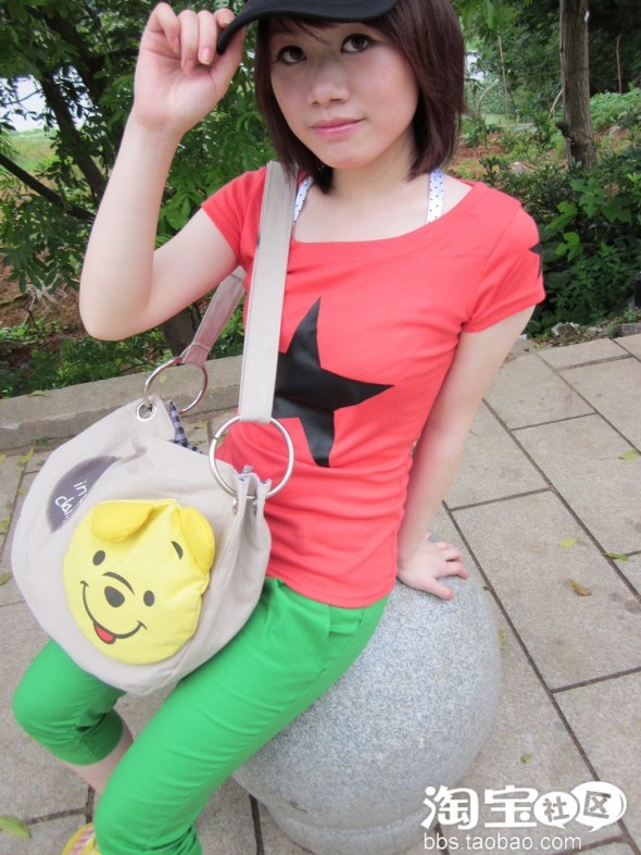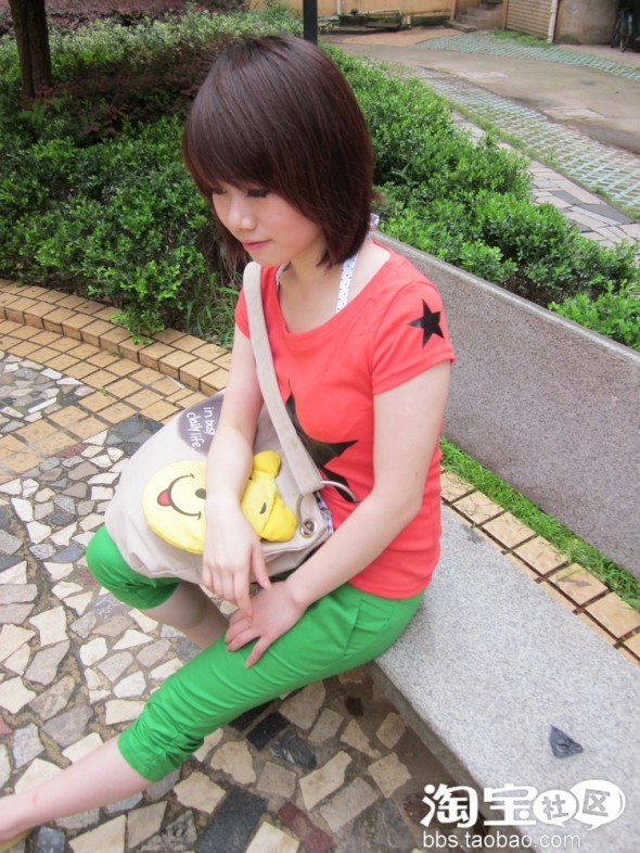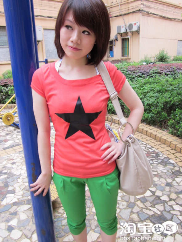 1.亮红色可爱小星星T恤+小脚皱褶五分裤+大帆布包包,打造甜美休闲小公主