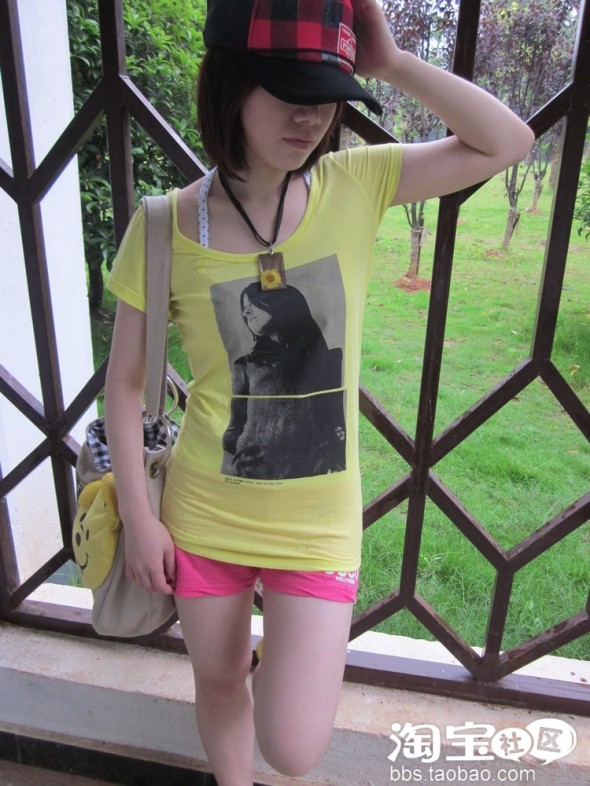 5. 人头个性T恤+小热裤+时尚大红色帽帽,打造沙滩运动小公主
