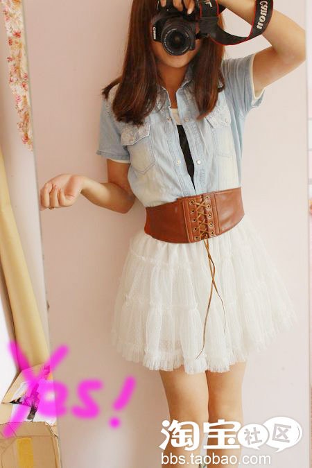 牛仔衬衫+蓬蓬裙,还有一定别忘了,腰封是很关键的哦。