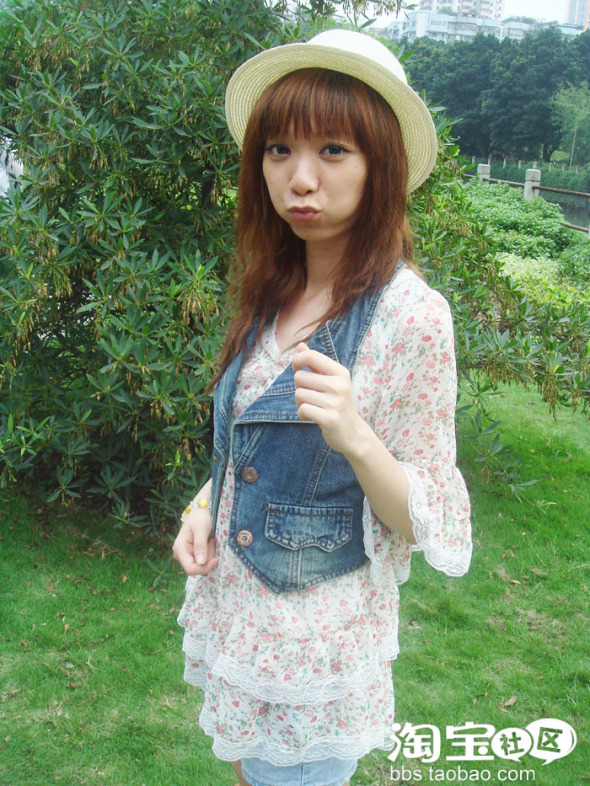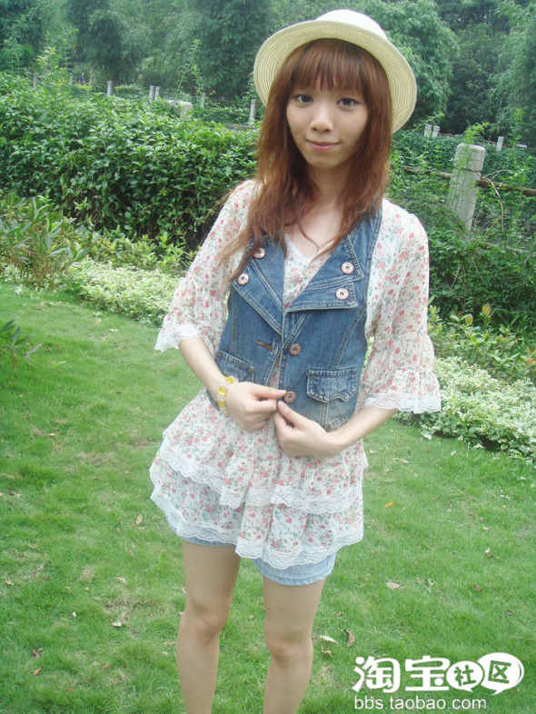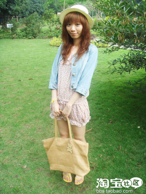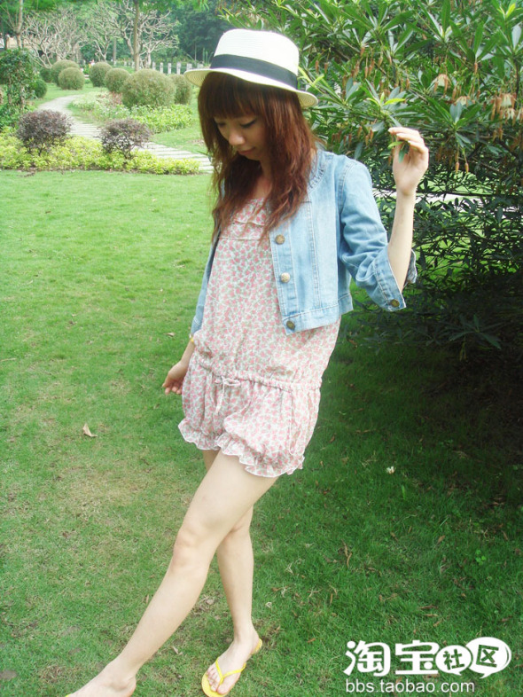 圆领牛仔短外套+雪纺碎花吊带+草包+草帽子(本人最喜欢)