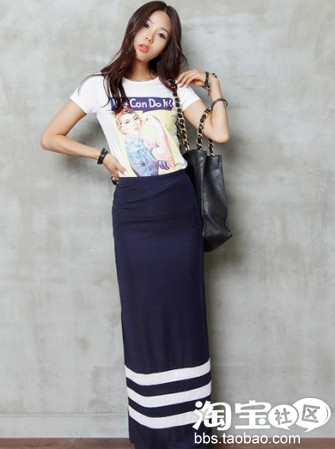 海军风格,蓝底白色条纹及踝长裙,是休闲校园风格的代表。运动风不减的这季,它依然让你范十