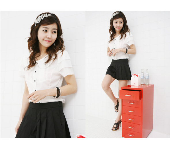 超爱的一款美衣,圆形的娃娃领口顿时令你的可爱度倍增,胸口的褶皱设计很好的凸显了身体的线条,最后袖口的层次设计更是别出心裁,可爱的同时更加知性。