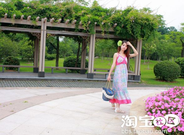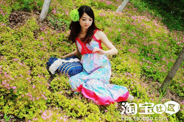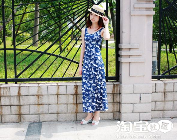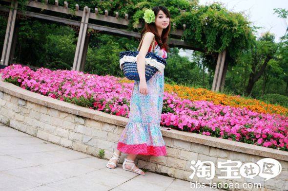 真喜欢这条长长的碎花雪纺缎连衣裙