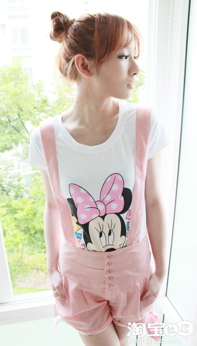 2.淑女高腰甜美蝴蝶结灯笼背带短裤+米奇头像短袖t