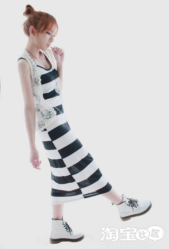3.蕾丝马夹+条纹背心长裙+马丁靴