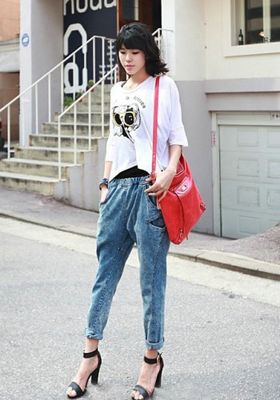 雪花裤与哈伦裤的结合,腰部的松紧设计不同于其它仔裤,更加休闲化,上面搭配宽松Tee,随意感十足却又很亮眼。