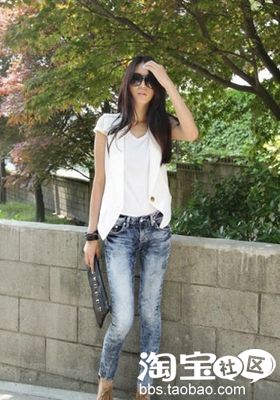 浅色的牛仔裤很是干净清爽,但是容易把大腿赘肉显现出来,这时借用长衫来遮掩一下比较好。