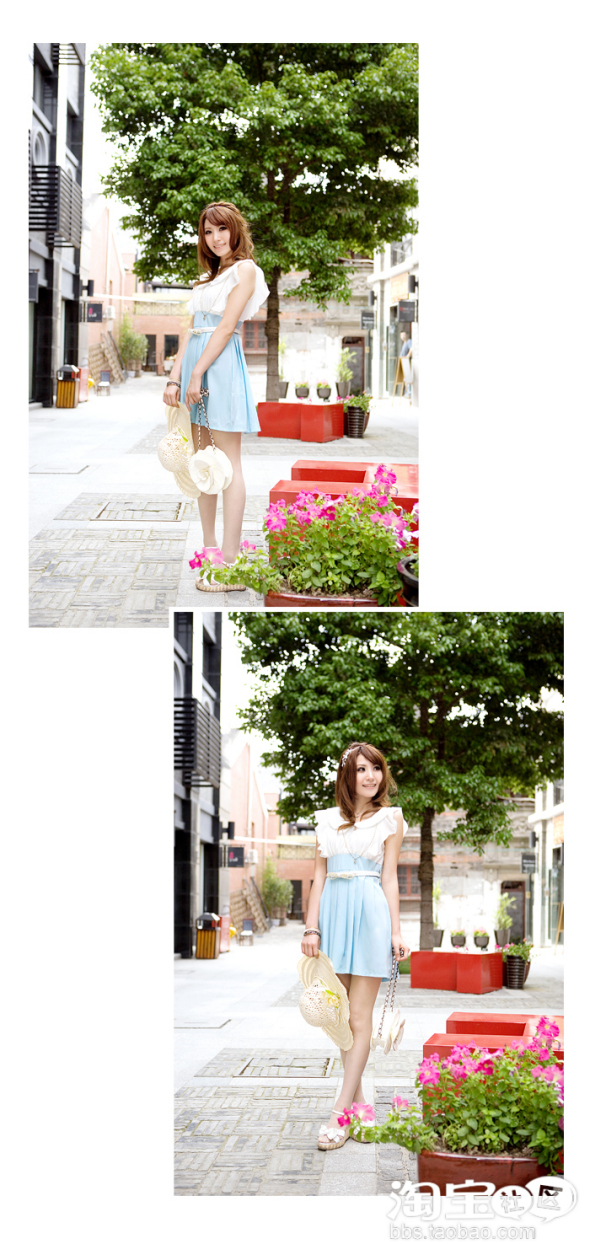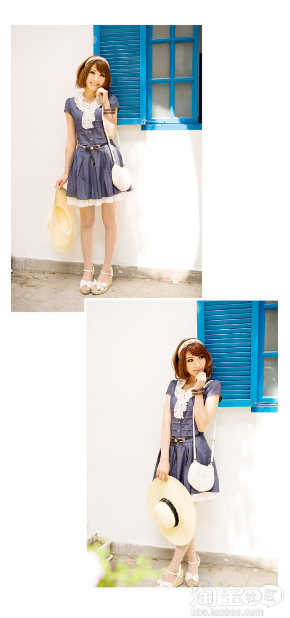 白色和浅蓝在一起就是很纯净的颜色.再加上款式的特别.就能在纯洁里透露出一种甜美的气息!