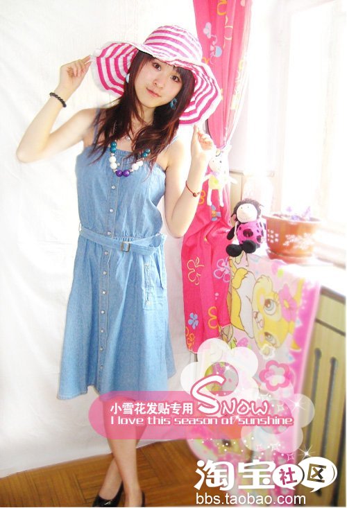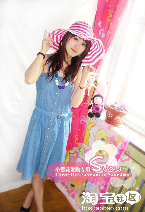 大毡帽+蓝色牛仔连衣裙,更适合赤着脚走在海边沙滩上,清新淡雅的感觉如同早晨的空气,如此舒适、自然……