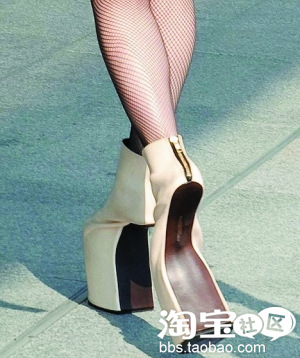 Alexander Mc Queen搞怪本领的确在时尚界首屈一指,他新设计的2010年春夏款“阿曼迪罗”鞋子系列绝对位居“最疯狂的鞋子”榜首。“阿曼迪罗”鞋高达12英寸(约为31厘米),一穿上你就能“拔地而起”,更难的部分是它弧形的设计,有人说像龙虾腿也有人把它形容为驴蹄子,总之,人类的脚背要适应那个幅度需要有重大牺牲精神。