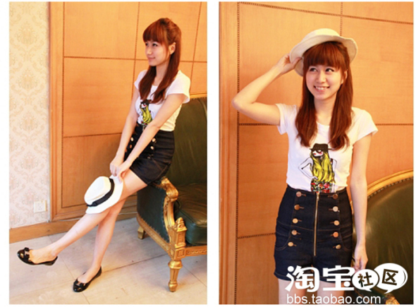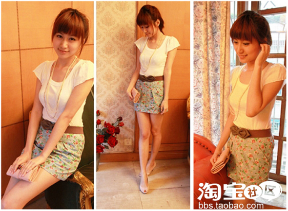 这款更是amanda自己的大爱了~ 简单的小飞袖白色T恤 搭配上牛仔小碎花花苞裙