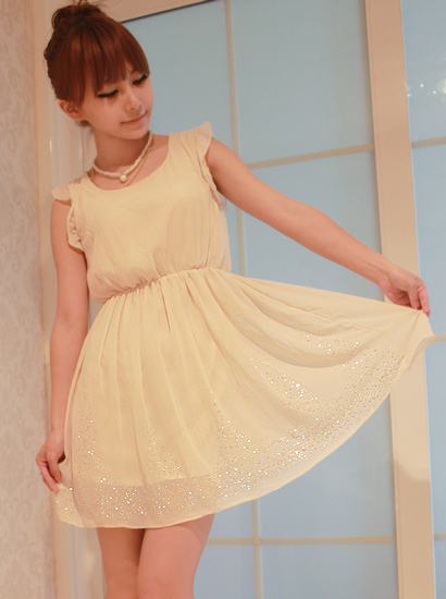 雪纺米色连衣裙+珍珠项链,打造气质清新公主