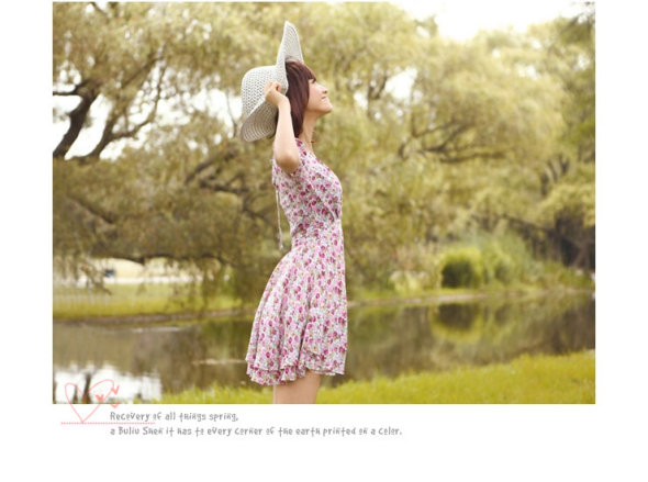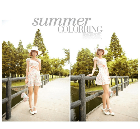 双V领耸肩碎花连衣裙柔嫩粉(送抹胸)